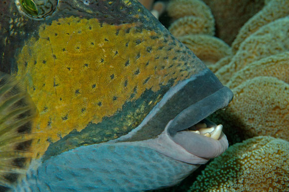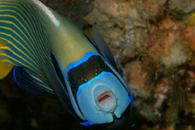 A destra. Un insolito primo piano del pesce angelo Pomacanthus imperator mette in evidenza i dentini. Disturbato, il maschio emette un suono schioccante con la mandibola.