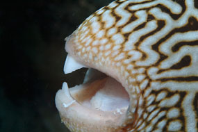 A sinistra. Primo piano sui 4 denti a scalpello del pesce palla Arothron mappa, che se ne serve per prelevare le sue prede dal fondo.
