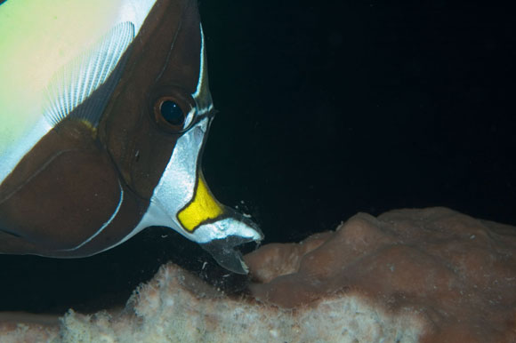 L’idolo moresco Zanclus cornutus utilizza la bocca piccola, allungata e provvista di denti a spazzolino per nutrirsi sui tessuti interni delle spugne, molli e ricchi di muco. Eccolo in azione.