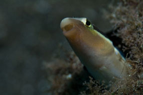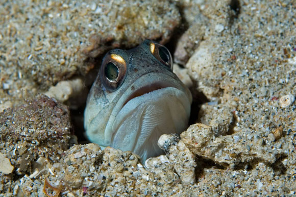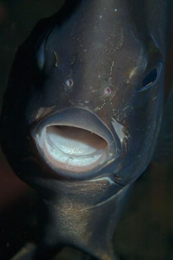 A sinistra. La bocca smisurata del pesce mascella Opistognathus sp. è utilizzata anche dal maschio per incubare le uova.