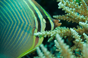 A sinistra. Incastro perfetto! La boccuccia affusolata del pesce farfalla Chaetodon baronessa lo abilita a tranciare i tentacoli dei polipi dei coralli del genere Acropora, dalle fitte ramificazioni.