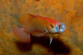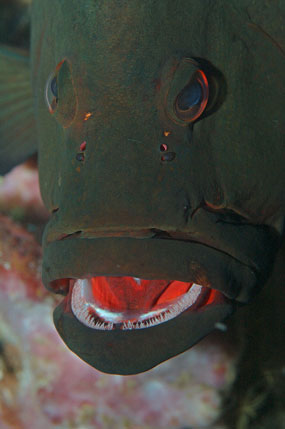 A destra. Cheilodipterus macrodon è un grosso pesce cardinale piscivoro. Dietro alla chiostra dei denti si possono vedere le uova, con gli occhi dei piccoli già visibili.