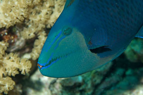 Niente apparecchio ortodontico per il pesce balestra Balistoides viridescens. I denti sporgenti, temibili, sono un ottimo strumento per staccare dal fondo organismi tenacemente attaccati.