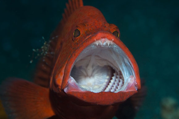 La bocca grande dei mangiatori di pesci permette la cattura di prede di grosse dimensioni. La cernia rossa Cephalopholis sonnerati.