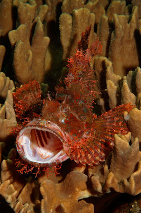 A destra. Nei predatori che cacciano all’agguato, come lo scorfano Scorpaenopsis oxycephala, la bocca grande permette catture fruttuose.