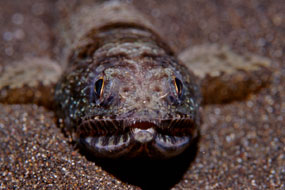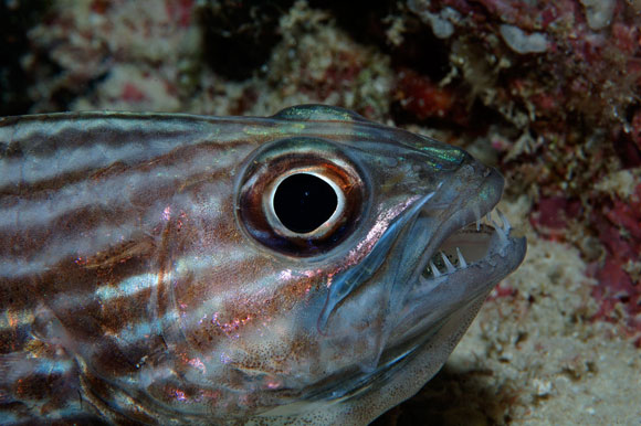 A sinistra. Il pesce lucertola Saurida nebulosa esibisce un ghigno poco rassicurante per le sue prede.