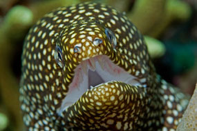 A destra. Come pugnali, i denti della murena Gymnothorax meleagris, posti anche sul palato, trafiggono la preda e la trattengono, con poche possibilità di scampo.
