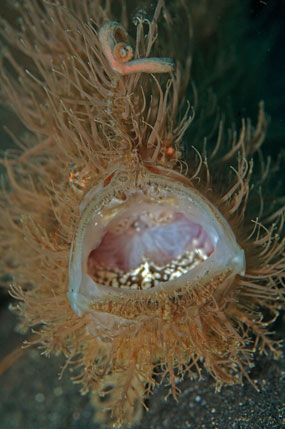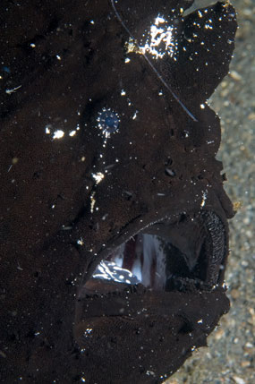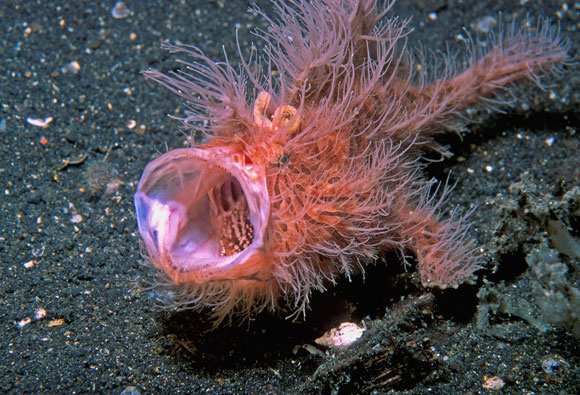 A destra. I pesci rana sono in grado di dilatare la bocca all’inverosimile per catturare prede quasi della loro stessa dimensione. La bocca spalancata del pesce rana peloso Antennarius striatus.