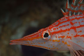 A sinistra. La bocca allungata del pesce falco Oxycirrhites typus si chiude con una rapidità straordinaria sui piccoli pesci.