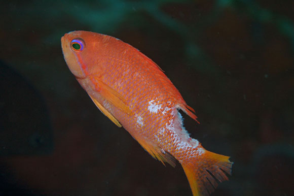 Come ci si sente dopo l’attacco di un pesce lucertola? Questo Pseudanthias squamipinnis è scampato ma ha riportato ferite devastanti, che lo rendono ora una preda facile.