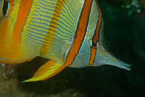 A sinistra. La bocca allungata del pesce farfalla Chelmon rostratus, adatta per catturare piccoli invertebrati tra i coralli.