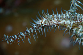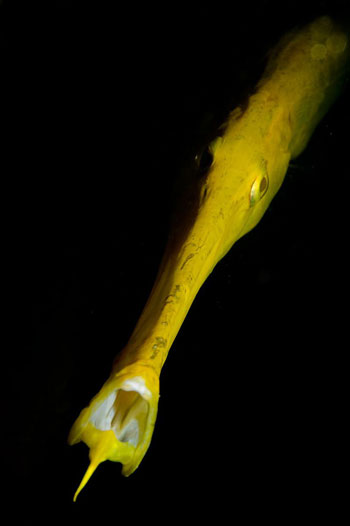 A destra. Come tutti i singnatiformi, il pesce fantasma Solenostomus paradoxus si avvantaggia della bocca a tubo per la cattura di piccole prede.