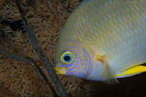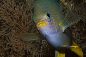 A sinistra. Deciso sul corallo: la castagnola dorata Amblyglyphidodon aureus, planctivoro, mostra degli incisivi invidiabili. Il maschio li usa per strappare i tessuti molli dei coralli neri e mettere a nudo lo scheletro dove la femmina deporrà le uova.