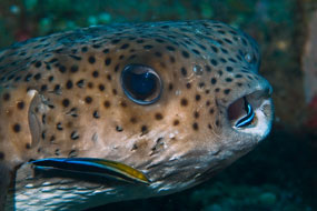 A sinistra. Il momento dell’igiene orale per i pesci richiede l’intervento di un pulitore. Labroides dimidiatus nella bocca del pesce istrice Diodon hystrix.