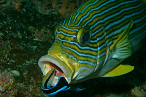 A destra. Il labbradolci Plectorhinchus polytaenia spalanca le fauci permettendo l’ingresso del pulitore Labroides dimidiatus. La pulizia è un momento importante nella giornata di ogni pesce.