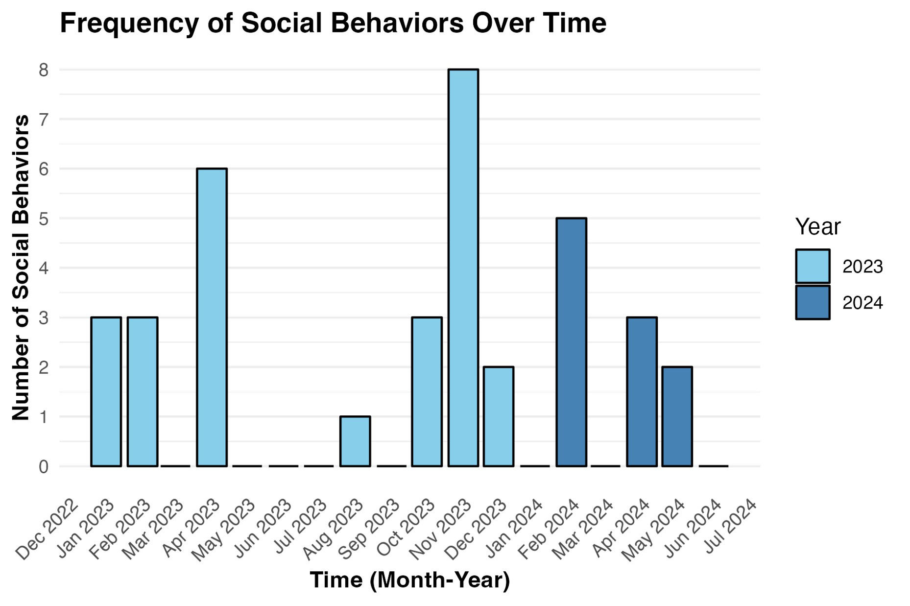 Le femmine mature hanno mostrato maggiori eventi di dominanza durante le interazioni rispetto alle femmine recentemente mature, a dimostrazione che femmine più grandi in taglia dominano su quelle più piccole. Allo stesso tempo, 3 femmine mature e 1 femmina recentemente matura hanno mostrato la maggior frequenza di interazioni sociali.