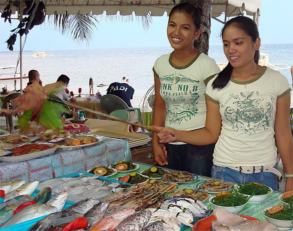 La cucina locale vede spesso accompagnare il riso alle portate principali, di pollo, pesce o maiale. Il pesce fresco è cucinato in diverse maniere ed è parte integrante della cucina filippina già dalla colazione fino alle cene, quando, lungo le spiagge viene proposto sul ghiaccio per facilitarne la scelta e poi essere grigliato in diretta.