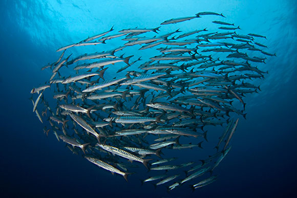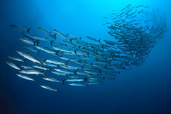 gruppo di barracuda che volteggiano come un unico organismo noncuranti della