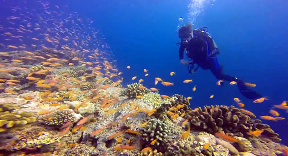 Queste immersioni terminano solitamente con una sosta di sicurezza sui reef dove il fondale si colora e anima di altri protagonisti, di dimensioni più piccole rispetto ai precedenti: murene, pesci chirurgo, farfalla,… e banchi infiniti di pesci di tutti i colori. Coralli, gorgonie, spugne coprono quasi interamente la scena. Anche sulle secche le immersioni sono spettacolari e con un po’ di fortuna si possono osservare le mante, probabilmente le più affascinanti creature marine di quest’area. Quando si incontrano queste Signore ci si ferma in contemplazione dell’eleganza con cui volano sopra i sub, quasi a godersi le bolle che risalgono dagli erogatori.