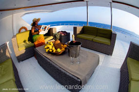 Ha tre spaziosi sun-deck (ponti-solarium) dotati di lettini prendisole e gli ampi spazi danno modo di rilassarsi godendo anche di una certa privacy. La zona ristorante si trova all’esterno, dislocata a poppa, ampia e ben protetta, perfetta per godersi i panorami offerti dalla barca in movimento.