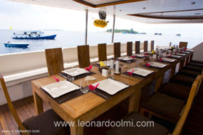 I menu proposti sono quelli tipici della cucina italiana e di quella maldiviana, a base di pesce fresco (con ottimi carpacci di tonno), ma l’equipaggio è sempre pronto a soddisfare le diverse esigenze dei suoi clienti. Se in qualche isola di pescatori si troveranno delle aragoste fresche appena pescate, una spaghettata ci scapperà senz’altro.