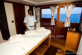 A sinistra, la zona di poppa adibita a ristorante, dove, oltre a un’ottima cucina, potremo gustarci anche lo scenario durante i nostri pasti. A destra, una delle nove camere del Duca di York, che non ha niente da invidiare a quelle di un resort. Qui non mancano né spazi né comfort, quali aria condizionata personalizzata e un ampio bagno con un grande box doccia. Non sono molte le crociere che offrono un relax totale dopo le immersioni, come nel caso di questa barca, dotata di un centro Spa specializzato in trattamenti ayurvedici.