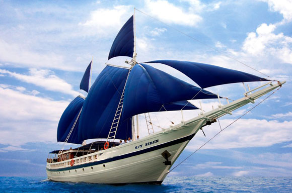 Sul Siren, invece, che è un veliero tradizionale indonesiano lungo 34 m (la cui operatività alle Maldive è iniziata proprio a luglio 2011), si trovano dettagli di gran classe e molto curati, come la sua totale costruzione in legno e teak, fatto appositamente per le attività subacquee, senza ovviamente tralasciare il comfort e la cura dei dettagli. Le sue cabine sono ampie, in grado di ospitare comodamente 14 ospiti in normali crociere, ma arrivando a ospitarne fino a 20 in occasione di crociere charter. È dotato di sette vele, un’ampia area relax, un’area da pranzo esterna e una coperta, ampio salone chiuso con bar, tv e area computer. Per gli ospiti sono predisposte 9 cabine, tutte dotate di bagno privato fornito di asciugacapelli, aria condizionata con controllo individuale, personal computer in grado di supportare i fotografi subacquei, sistema audio-video. A disposizione degli ospiti, attrezzature complete subacquee Aqualung (per le sole torce e i computer è previsto il pagamento del noleggio).