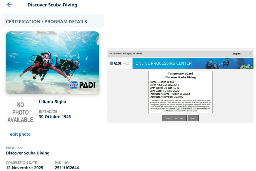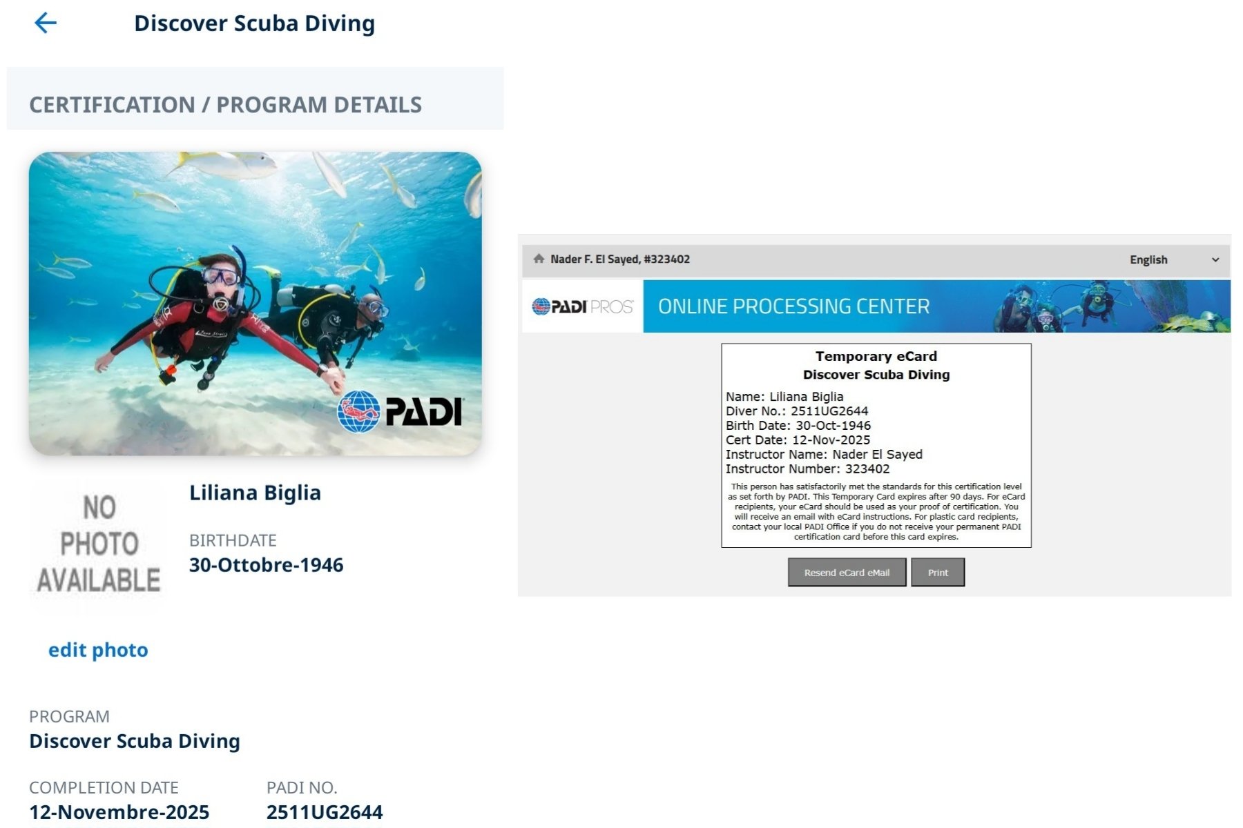 Liliana Biglia ha svolto la sua prima esperienza Discover Scuba Diving PADI il 12 novembre, durante una giornata in barca a Ras Mohammed, a bordo dello yacht Ceasar1 di Sharks Diving Sharm. Non aveva mai usato maschera, boccaglio o altra attrezzatura, ma ha sempre amato il mare. Il figlio Luigi l’ha accompagnata e, insieme all’istruttore Nader El Sayed, le ha dato i primi rudimenti dell’immersione.