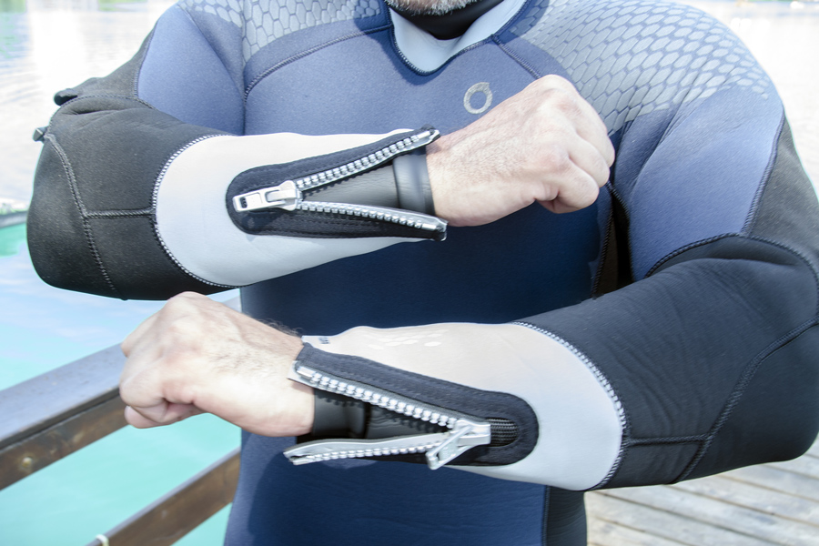 Le doppie cerniere sui polsi consentono di aprire più ampiamente l’apertura del manicotto, facilitando l’inserimento delle braccia nella muta. Questa caratteristica è particolarmente apprezzata da coloro che hanno difficoltà a far passare le braccia attraverso gli stretti manicotti delle mute tradizionali.