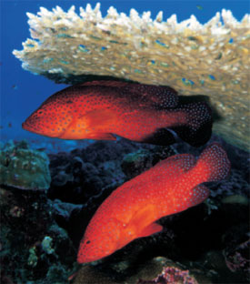 Le pareti delle formazioni coralline ospitano forse la più alta concentrazione del mondo di Anemoni attorno ai quali nuotano centinaia di pesci pagliaccio, enormi gorgonie di vari tipi e colorazioni crescono ovunque sui pendii dove alcionari e acropore si contendono gli spazi non colonizzati. Gruppi di piccoli barracuda si aggirano lenti studiando il momento dell’attacco e tutto il campionario dei coloratissimi abitanti della barriera è ben rappresentato: coppie di pesci farfalla di vari tipi, pappagalli, chirurghi, imperatori, anthias . Una tale abbondanza di pesce attira nella zona tutti i predatori pelagici che si possono immaginare.