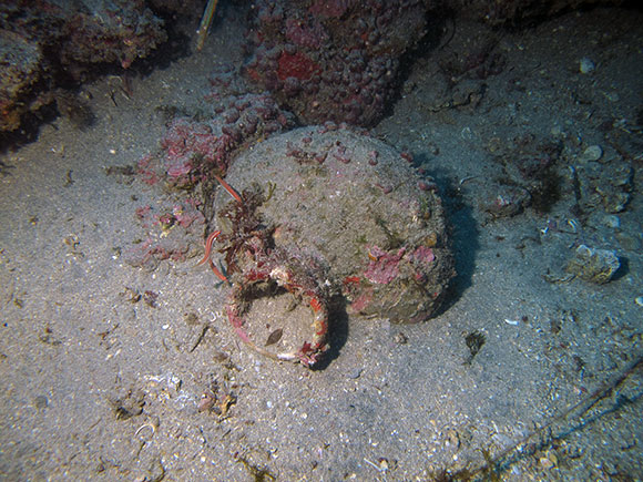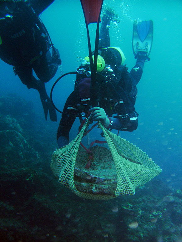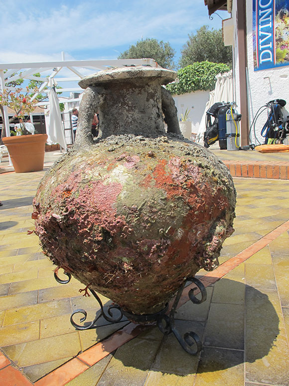 Ultimata la sorbonatura, il reperto viene imbragato a un pallone da sollevamento e condotto in superficie, caricato su un gommone e finalmente deposto a terra. Procediamo poi a svuotarlo dal fango, cercandovi piccole tracce utili ad una datazione. Rinveniamo vari tipi di conchiglie e concrezioni progressivamente più antiche; alla fine lo stile risulterà essere corinzio, risalente al VI sec. a.C.
