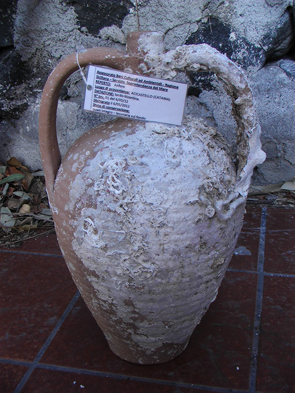 La prima anfora è affidata, insieme al ceppo d’ancora, al Museo del Mare di Ognina; nelle settimane successive verranno poi recuperate le altre, queste parzialmente frammentate e oggi in corso di ricostruzione. Un altro passo è rappresentato dal recupero di un dolium, ridotto in una ventina di grossi frammenti sparsi lungo la franata; quest’azione viene portata a termine nel Gennaio 2013, impiegando palloni da sollevamento dai 30 ai 500 kg.