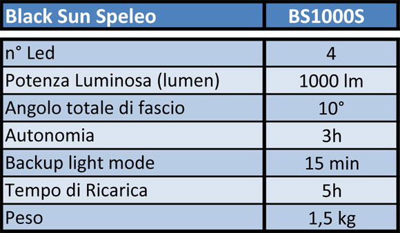 Per il modello speleo è possibile scegliere tra maniglia in alluminio marino su testa illuminate e pacco batteria (BlackSun1000S) oppure maniglia goodmann in alluminio marino e cinghiaggio pacco batteria (BlackSun1000SP).