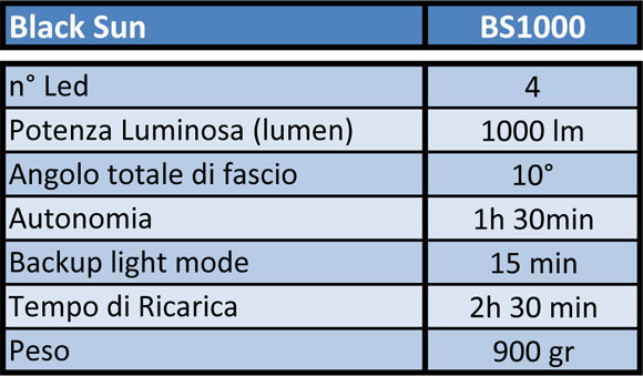 Le BlackSun sono dotate di 4 Led ultima generazione, inoltre vantano un nuovo vetro ottico temperato per aumentare l’efficenza luminosa ed il corpo batteria e la testa illuminante in derlin ed alluminio marino anticorodal 6082.