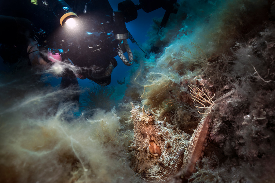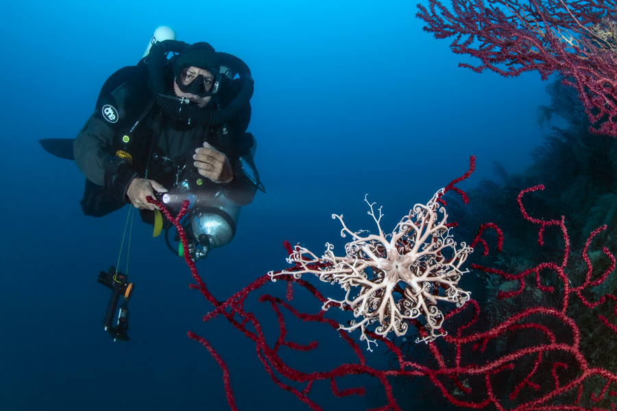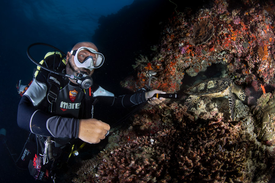 Altresì con la luce rossa è possibile fotografare, senza influenzare o spaventare il soggetto, i famosi Mandarin Fish durante l’accoppiamento o la bellissima stella gorgone in notturna con le braccia aperte durante la cattura del cibo. Infine con la luce ultravioletta è possibile immortalare l’incredibile biofluorescenza delle creature marine che brillano di inchiostro altrimenti invisibile all’occhio umano.
