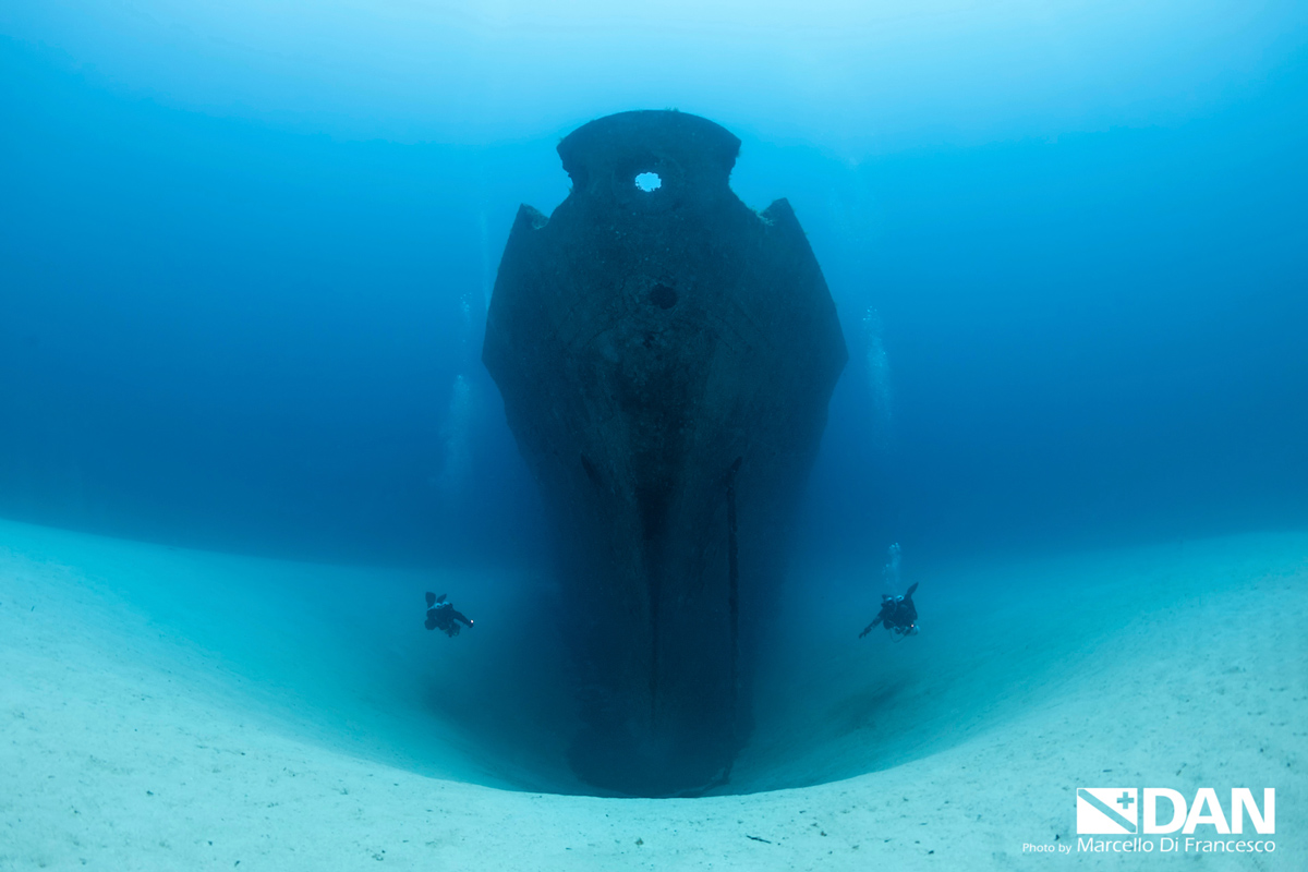 Noi, ad Orangeshark Diving Centre, facciamo sempre due immersioni su questo relitto, una intorno allo scafo, passando tra il grande timone e l’elica a 35 metri di profondità e una all’interno, compreso la sala macchine. La facciamo sempre in Nitrox e sempre con i nostri scooters, così da riuscire ad esplorarla tutta e non avere problemi anche in caso di corrente.
