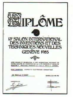 L’invenzione fu brevettata e vinse il secondo premio, la medaglia d’argento nel settore “apparecchiature di sicurezza e di salvataggio”, al 13° Salone Internazionale delle Invenzioni e delle Nuove Tecnologie di Ginevra nell’anno 1985.