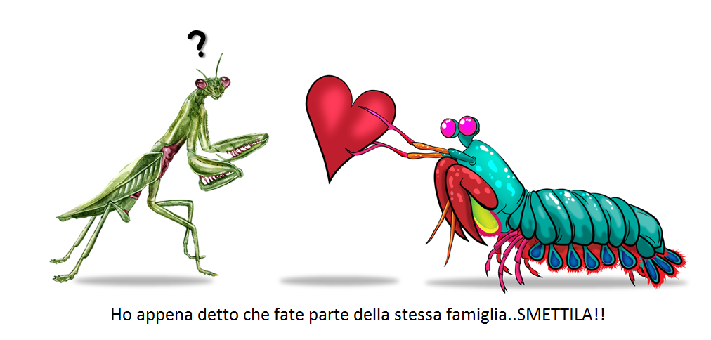 Chissà se ne avete mai sentito parlare!? Il gambero-mantide, il ‘pugile del mare’.. Curioso vero? I nomi che gli sono stati affibbiati, intendo. E non è finita! Locusta di mare, gambero assassino o ‘thumbs splitter’, letteralmente, lo ‘sfasciapollici’. Rassicurante eh?! Un nome particolare, una fama che pesa, tante leggende al suo seguito. Strano come un animaletto di poco più di 20 cm possa richiamare così tanta attenzione. Ma se la merita, credetemi. Con gambero-mantide si intende praticamente tutto un Ordine di organismi marini, quello degli Stomatopodi, composto da più di 300 specie similari. Sono genericamente organismi quasi esclusivamente marini e si trovano in acque basse, principalmente nascosti tra le rocce, in anfratti o in buchi scavati nella sabbia. Quasi tutti preferiscono acque relativamente calde distribuendosi principalmente sulla fascia dell’Equatore. Questi animali, simili nelle forme alle nostre cicale di mare (chiamate anche con un termine meno aulico ‘canocchie’) sono Crostacei, appartenendo quindi allo stesso grande gruppo che comprende granchi, gamberetti, paguri e aragoste e tutti quegli animali marini che possiedono una ‘crosta’, ovvero una scorza dura che li protegge. Sono sicura siano altrettanto deliziosi, ma come potete ben immaginare non è di questo che voglio parlare! Prima di tutto, perché gambero-mantide. Magari lo immaginate già, per chiunque abbia mai visto una mantide religiosa da vicino il collegamento è diretto. Entrambi appartengono allo stesso grande gruppo (Phylum) degli Artropodi. Questo vuol dire che una mantide terrestre e un gambero marino, che vivono in due mondi agli antipodi, hanno una relazione di parentela più stretta di quella che un pesce e il gambero stesso possano mai avere, anche se condividono lo stesso ecosistema. foto-mantis-love-caption Ma questa è una considerazione fine, non salta all’occhio subito. Un soprannome deve essere indicativo, nei limiti del possibile. Presentare come ‘Il Secco’ un vostro amico di 1 metro e 90 per 120 chili non aiuterebbe, per chi non lo conosce, ad individuarlo tra la folla.. Guardate le zampe, la postura delle zampe anteriori. Se queste foto non vi convincono cercatene altre mille. Le appendici frontali sono divise in segmenti, due dei quali sono mantenuti vicino al corpo, ripiegati. In soldoni, la mantide prega, il gambero pure. Semplice. Questo dettaglio strutturale vale per tutti i gamberi-mantide ed è solo questione di postura, comune a tutte le centinaia di specie appartenenti a quest’Ordine. Ma ce n’è una, in particolare, unica nel suo genere, che merita tutta la nostra attenzione. La sua fama scatena le fantasie dei neofiti di Biologia Marina e la sua etologia, suo malgrado, è la ragione di tutti quei soprannomi. Una sorta di affascinante, coloratissima, leggenda metropolitana. Signori e Signore lasciate che vi parli del gambero-mantide per eccellenza, l’unico e vero pugile del mare, la canocchia pavone, Odontodactylus scyllarus! Il nome latino l’ho messo solo perché le canocchie comuni, che noi tutti conosciamo e apprezziamo – per lo più in ristorantini sul mare – appartengono al genere Squilla, e non Odontodactylus. Quindi parenti si, ma non così simili. Una bellezza disarmante la sua. Perché canocchia pavone? Basta guardarla è evidente. I colori del suo carapace sono vivi, cangianti, splendenti e soprattutto..indescrivibili. Nel senso reale del termine però. Cosa intendo? Che la bellezza si mostra agli occhi che la sanno vedere. O meglio. Agli occhi che sono fisicamente strutturati a percepirla. La scienza toglie molto romanticismo alle cose.. Sapete come vediamo noi, a grandi linee? All’interno dell’occhio, nella retina abbiamo delle cellule, i coni, che contengono un pigmento visivo chiamato opsina che ha un picco di sensibilità o blu o rosso o verde. La nostra percezione del mondo si basa su una visione tricromatica. Blu. Rosso. Verde. I colori primari. Noi guardiamo un oggetto, le informazioni vengono mandate dall’occhio al cervello che elabora ed è in grado di dirci che colore abbiamo davanti, come se fossimo in grado di combinare quei tre soli colori per crearne altri mille (licenza poetica, non mi prendete letteralmente). Sapete quante opsine, ovvero colori base, combinano gli occhi di una canocchia pavone? SEDICI. Se siete familiari con il calcolo combinatorio, il numero di combinazioni possibili potrebbe farvi esplodere il cervello. Riuscite ad immaginare con che vivacità viene percepito il mondo intorno a loro? Tecnicamente non vedono più colori di noi, ma li percepiscono ad intensità a noi sconosciute. E come se vedessero, citando un grande appassionato del genere, ‘una bomba termonucleare di luce e bellezza.’ Occhi speciali i loro, peduncolati, composti e divisi in tre porzioni ciascuno, ognuna delle quali contiene una sorta di pupilla che di concerto con le altre, sovrapponendo le immagini, crea una visione nitida e permette la percezione della profondità, così che ogni occhio possa essere usato indipendentemente. foto-peacock-mantis Gli stomatopodi sono l’unico ordine di crostacei esclusivamente predatori, non si nutrono mai di resti di altri animali ma sono cacciatori attivi, veloci e precisi, una vista più che ottima è necessaria. Ah, e percepiscono la luce polarizzata. Non è il caso di entrare nel dettaglio di questo tipo di luce, visto che ho esaurito le mie conoscenze di fisica il giorno stesso dell’esame. O anche prima. Ma vi basti pensare a come cambia la percezione del mondo intorno a noi quando indossiamo degli occhiali polarizzati. Praticamente gli occhi di questi animali sono lettori DVD, con dei Polaroid incorporati. Nessun’altro animale sulla faccia della terra può farlo. La cuticola di varie parti del corpo polarizza la luce usando appositi pigmenti colorati e il segnale può essere percepito SOLO dai conspecifici, come una sorta di linguaggio segreto. Sono una specie s