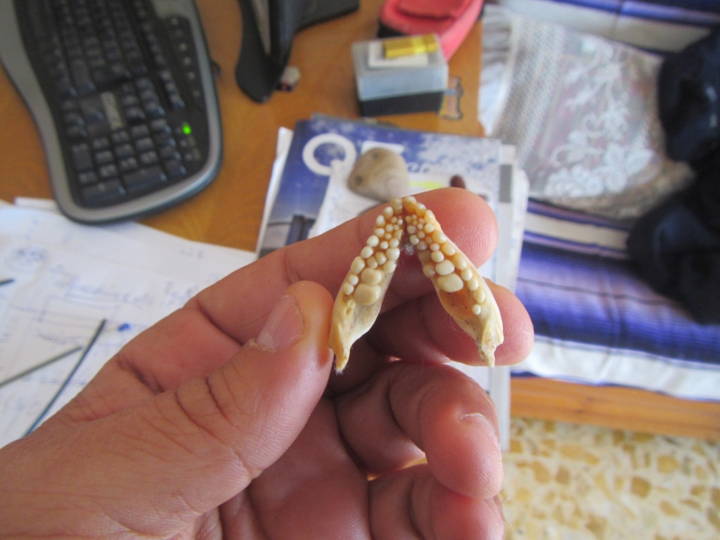 7 Mandibola di orata: L’orata è un pesce durofago, cioè si nutre di crostacei e molluschi. Lo si intuisce osservando i suoi denti larghi e piatti, adatti a frantumare i gusci delle prede che afferra con i denti anteriori appuntiti.