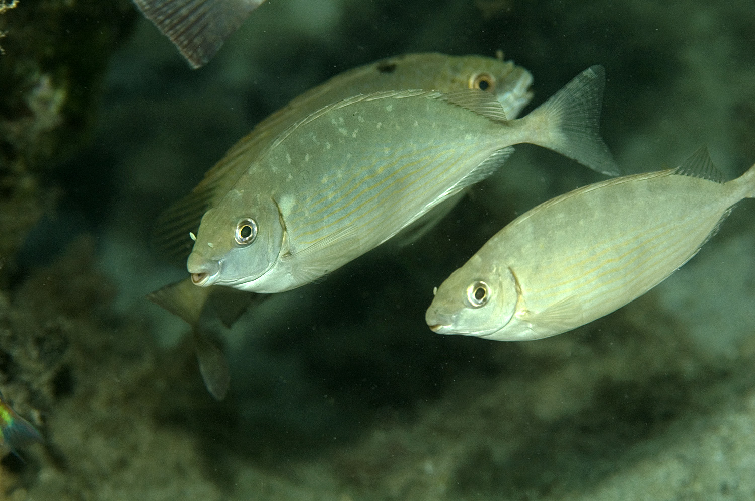 Foto di Massimo Boyer – Siganus rivulatus (pesce coniglio marezzato). In apertura Fistularia commersoni (pesce flauto). Entrabe le specie sono entrate in Mediterraneo attraverso Suez.