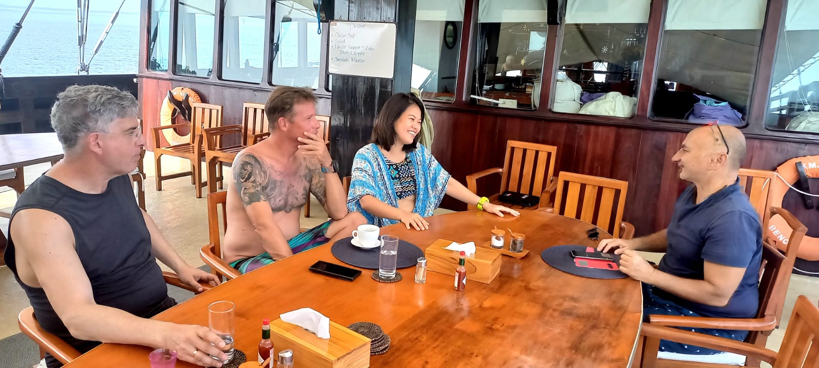 Alcuni ospiti approfittano dell’opportunità di approfondire le loro conoscenze sulla vita marina grazie alla biblioteca di bordo, dove Yann e il suo team sono sempre pronti ad aiutare nell’identificazione di alcune delle migliaia di pesci, creature e coralli presenti nel cuore del Triangolo dei Coralli. Che si tratti di conversare con l’equipaggio o semplicemente di immergersi nello splendido scenario, la Dewi Nusantara offre qualcosa per tutti.