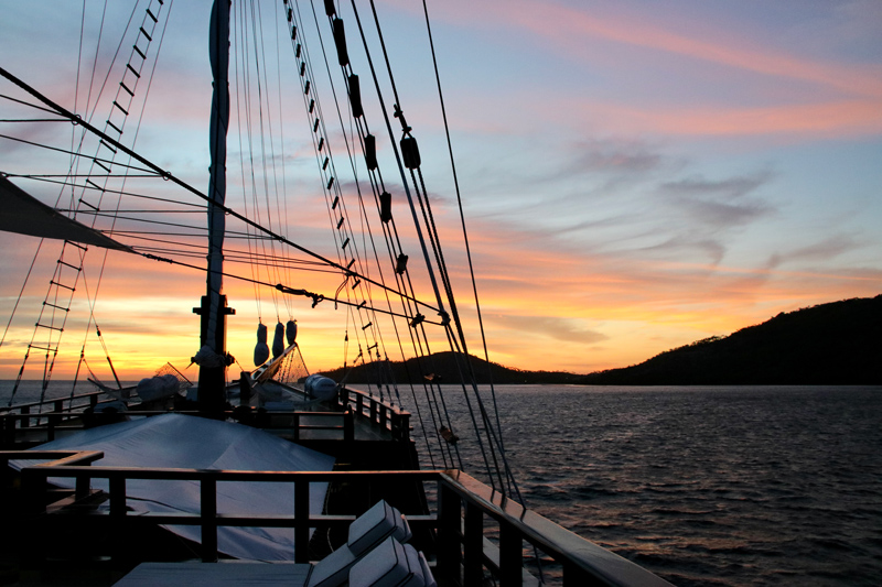 La giornata a bordo della Dewi Nusantara inizia dolcemente, con i primi raggi di sole che attraversano l’orizzonte. Ancorata in acque turchesi, la goletta offre viste panoramiche su isole incontaminate e barriere coralline immacolate. Il ritmo delle onde che lambiscono lo scafo e i richiami lontani degli uccelli marini creano una sinfonia rilassante.