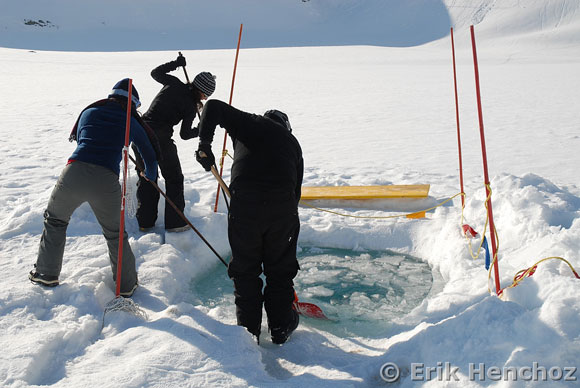 Si rompe lo strato di ghiaccio formatosi sul foro d’entrata durante la notte.