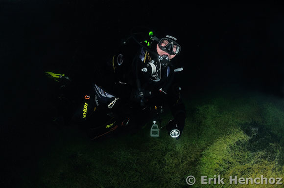 torce subacquee illuminano il fondale.