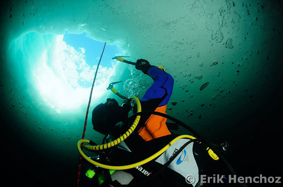 subacqueo" che si muove appeso ad una lastra di ghiaccio