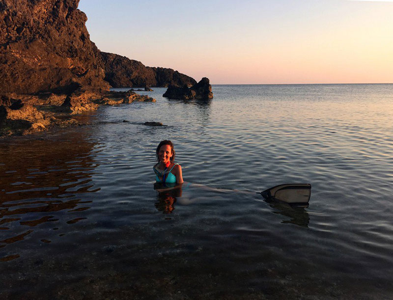 Il cielo aveva già assunto i colori caldi e dorati tipici del tramonto ed in terra come in mare, quel periodo che intercorre tra il giorno e la notte è sempre il più calmo e rilassante. Preparo maschera e pinne ed entro in acqua. Caspita, è caldissima! In superficie ci sono 27/28 gradi… temperature tropicali direi.