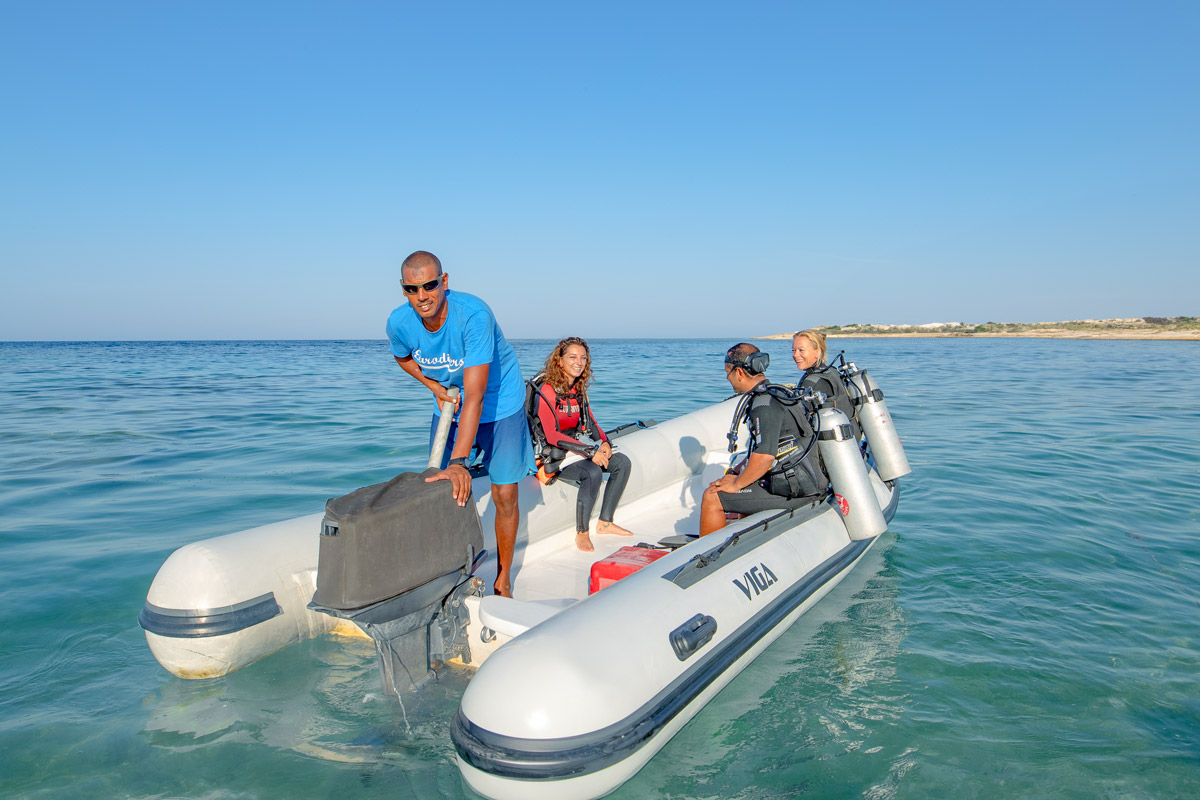 Ras Allasad come piattaforma operativa: immersioni da riva, supporto con gommoni e nitrox gratuito.