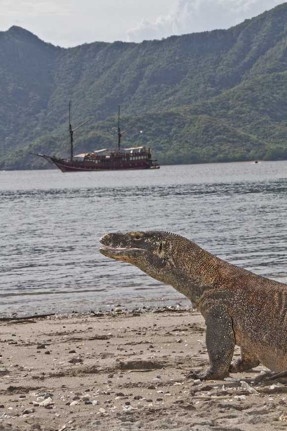 Un grande esemplare di drago di Komodo che scruta la sagoma di Arenui dal sud dell’isola di Rinca (@ Michael Christ)