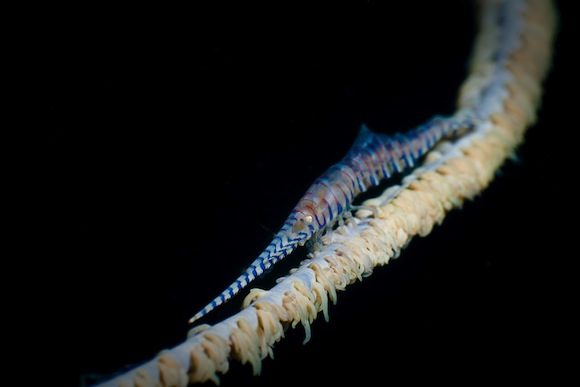 Cespugli di corallo nero nascondono pesci ago fantasma e gamberetti sega.