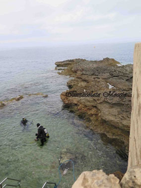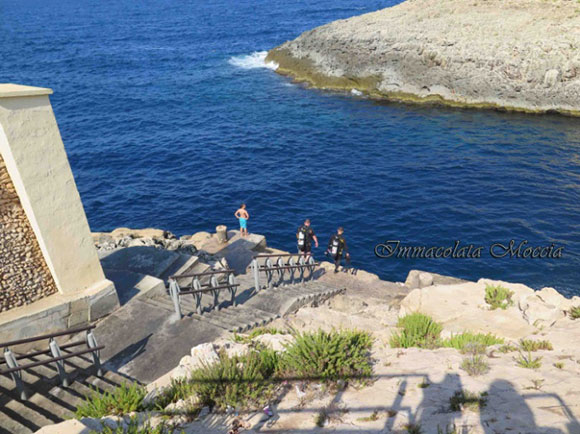 Due mezze giornate di due giorni per un totale di quattro immersioni, concordiamo con il diving center di Bugibba, Acquatica Diving Center. Quindi appuntamento domattina. Prendo quel che resta della mia valigia dive, nella quale mi sono portata solo muta, pinne, calzari, maschera, fotocamera con scafandro, e il mio logbook con i relativi brevetti. Il furgoncino mi aspetta giù e comincio ad articolare quattro parole in inglese per cercare di capire se la persona che mi è venuta a prendere, parla in italiano, per fortuna è di Milano ma la mia guida dive non lo sarà, porca paletta come presupponevo, sarà compito arduo capire il briefing, ma l italiano c’è e poi i segnali subacquei sono internazionali, uindi penso che ci capiremo meglio sott’acqua che fuori. Dopo le presentazioni al diving, compilo il solito questionario, con il relativo scarico di responsabilità, comincio a parlare con il supervisore del diving ( anche lui parla italiano, mi sono salvata un’altra volta) mi chiede da quanto non mi immergo e quante immersioni ho. Si tranquillizza anche lui riguardo il io storico subacqueo e si procede con la preparazione della cesta. Dopo pochi minuti siamo sul furgoncino che ci porta ancora più a nord, chiacchiero con Alex, la guida italiana, sulla meta del posto e sull’ immersione in se: location – Cirkewwa la zona dove partono i Ferry per Gozo, un isoletta che è il top dell’isola sotto l’ aspetto dive.